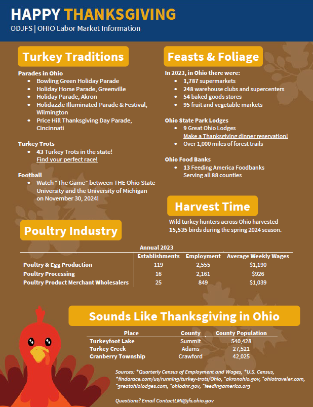 November 2024Ohio’s labor market plays a major role in bringing your Thanksgiving feast to life. From turkey to traditions, our state’s contributions are something to be thankful for.