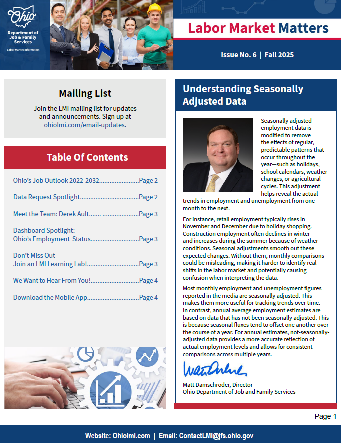 April 2025This quarterly newsletter focuses on Ohio’s industries. Explore new data and resources to track industry changes and spot trends in the labor market.